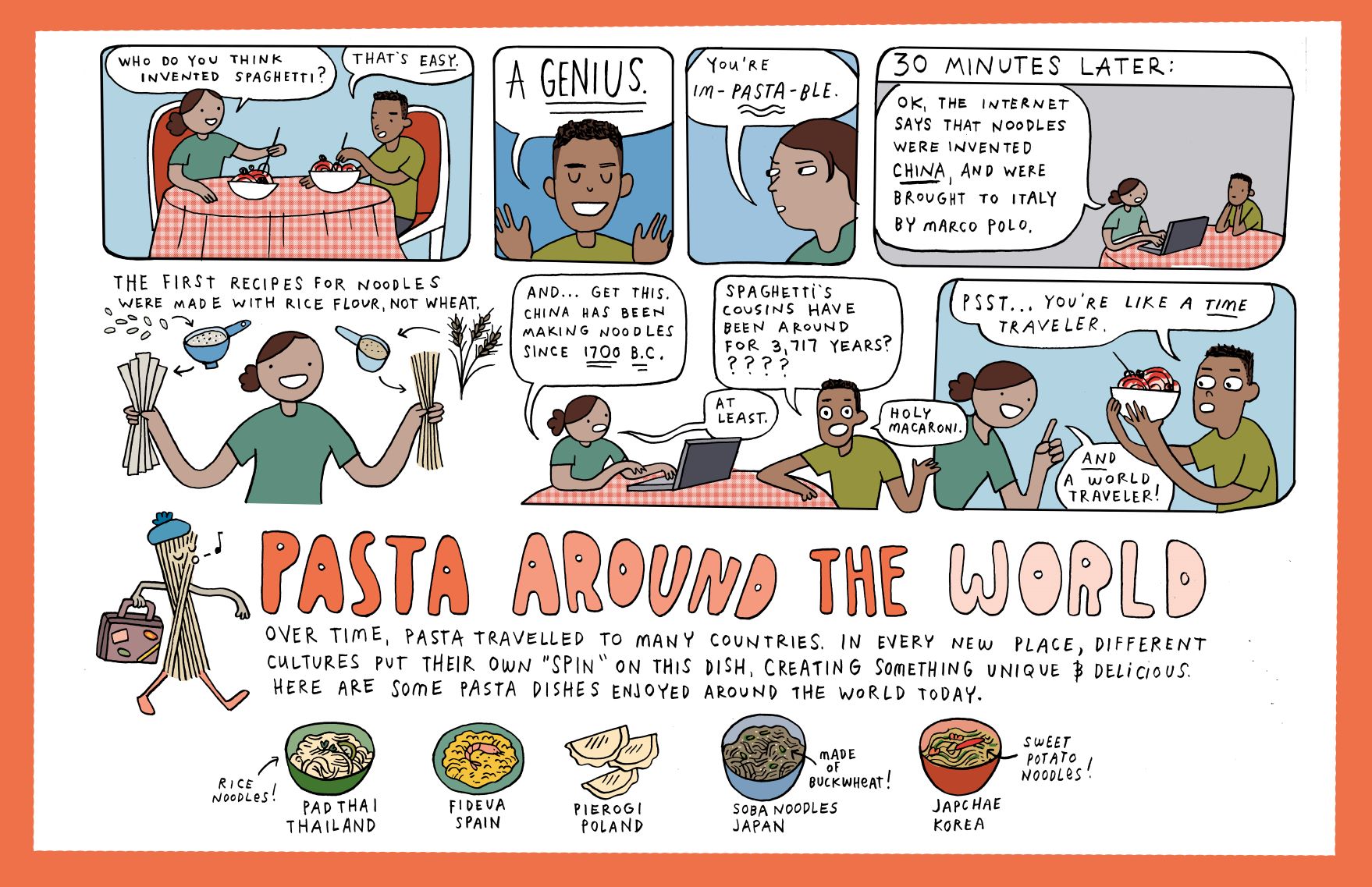 Use this pasta placemat with your students as you sample a pasta dish. This placemat includes fun examples of different pasta dishes made around the world, the history of pasta, and a delicious pasta recipe.